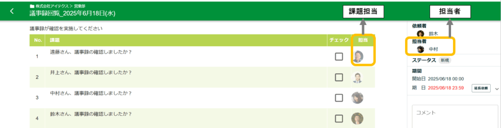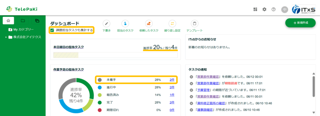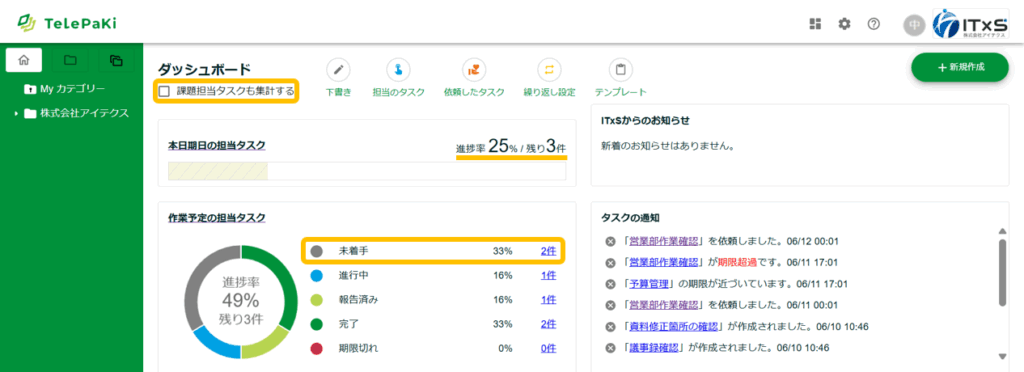 まず担当者と課題担当について、ご説明します。担当者は、タスクの完了報告をするなど、タスクの責任者のような役割です。課題担当は、タスクの中に1つずつ課題があり、その課題の担当者です。 ダッシュボード上部にある課題担当タスクも集計するチェックボックスがついている状態のときは、自分が課題担当になっているタスクを含めた情報が、ダッシュボードに表示されます。 チェックを外すと自分が課題担当になっているタスクの表示はありません。自分が担当者のタスクの情報がダッシュボードに表示されます。