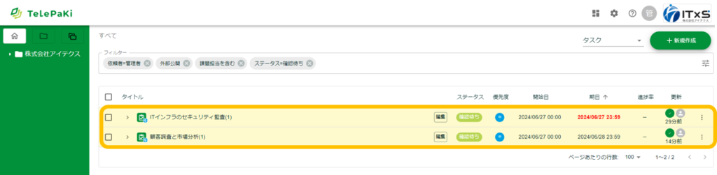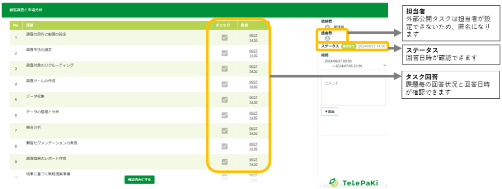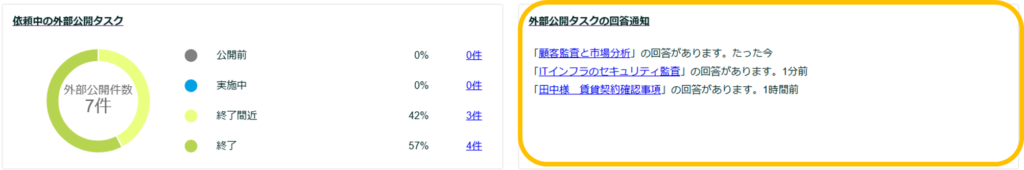 ダッシュボードから、外部公開タスクの回答通知を確認できます。これは依頼している公開中の外部公開タスクの中で、回答があり確認待ちのタスクです。 外部公開タスクの回答通知をクリックすると、確認待ちの外部公開タスクのリストが表示されます。 外部公開タスクの回答状況に表示されている確認待ちタスクのタイトルをクリックすることで、タスクの回答内容がすぐ表示されます。