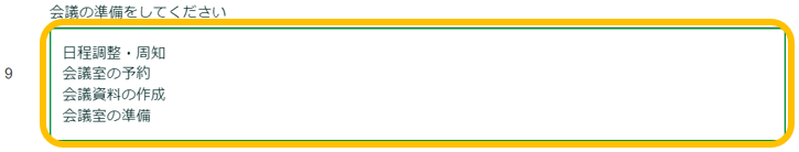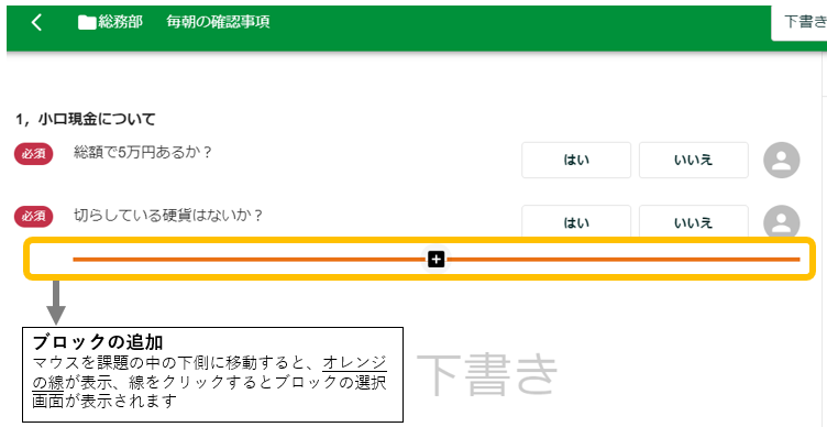 タスクの作成中、はい・いいえ、チェックだけでない、異なった形式の返答が欲しいときは、ブロックが便利です。オレンジの線をクリックで子ブロックの追加ができます。