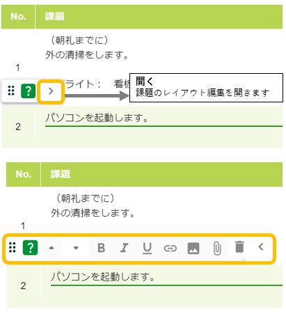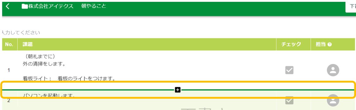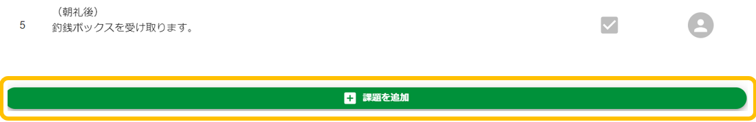 - 次の課題を入力します。画面一番下にある、課題を追加をクリック(またはctrl+q)します。または、課題の追加は課題と課題の間にマウスを動かして出てくる緑の線を、クリック。