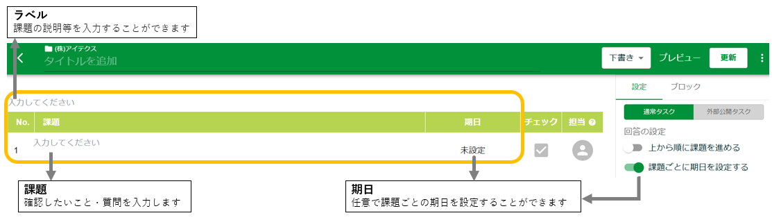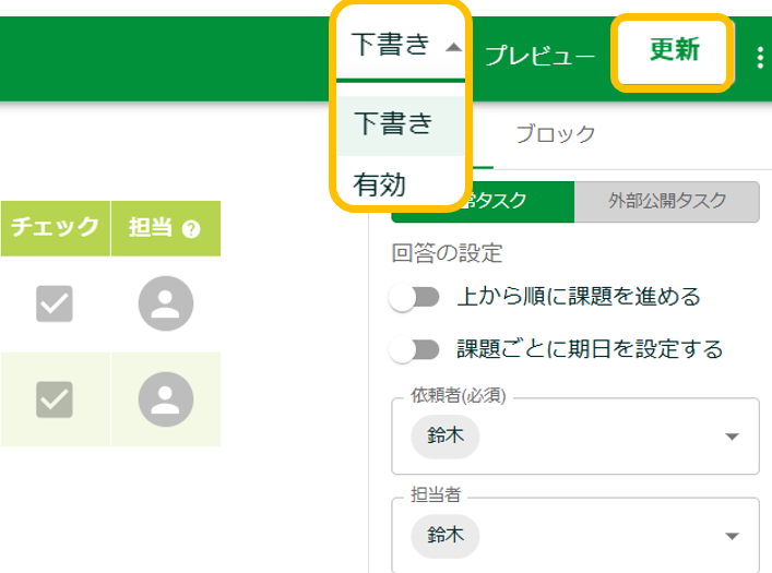 右上の下書きか、有効を選び、更新をクリックします。有効を選ぶと、回答できる状態になります。これでタスクの作成が完了です!