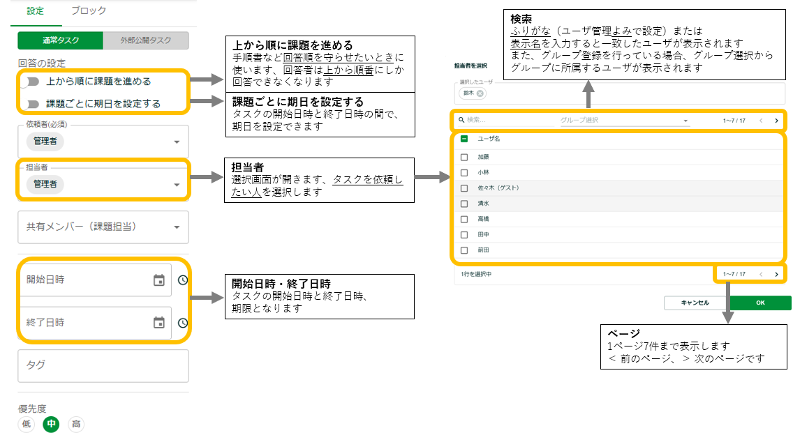 開始日時・終了日時は、タスクの期間となります。その他、タグ、優先度など必要に応じて設定します。