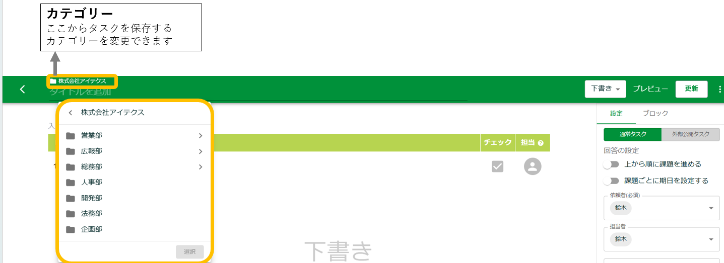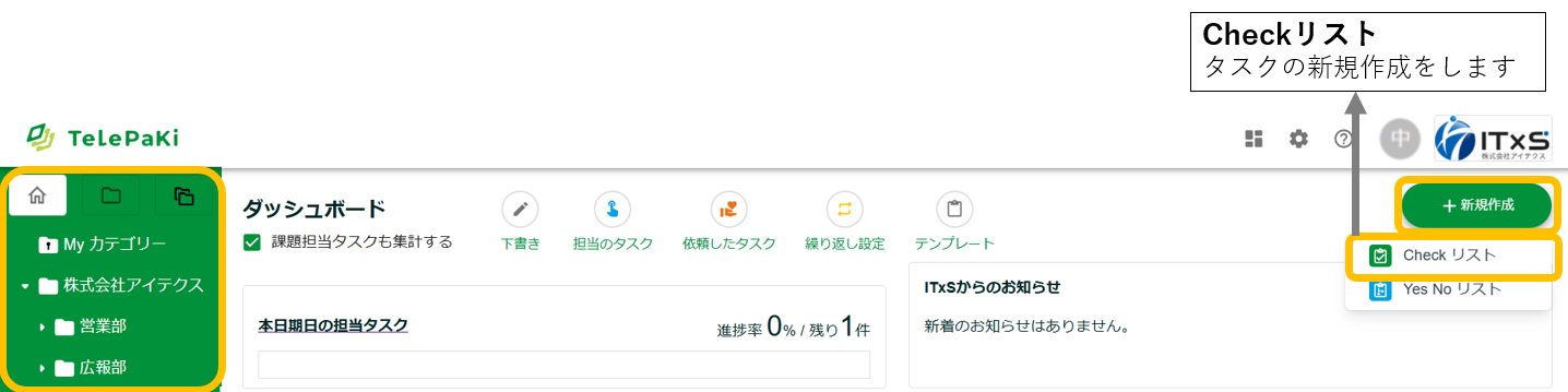 2つ目のパターンは、ダッシュボードから新規作成 > Check リストを選択し、タスク作成の画面からカテゴリーを選択する方法です。
