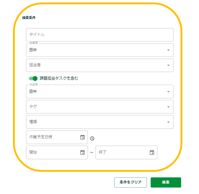 - フィルター … タスクを検索することができます。下の検索条件の内容で絞ることができます。