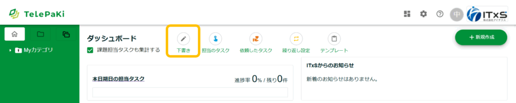 ダッシュボードから、下書きを選択すると、下書き中のタスクが確認できます。