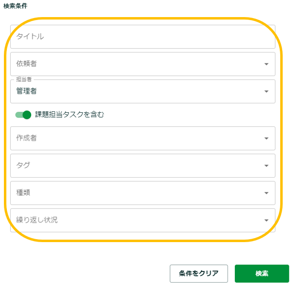 - フィルター … 繰り返しタスクを検索することができます。下の検索条件の内容で絞ることができます。