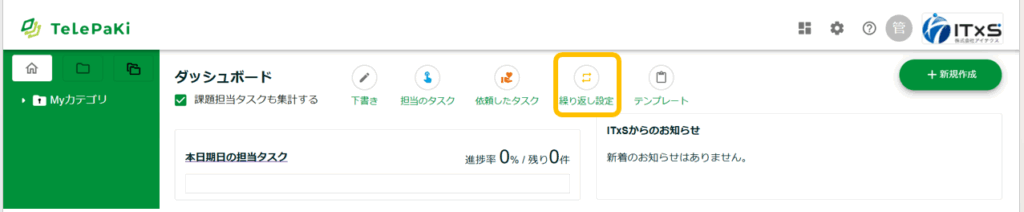 - 繰り返しタスク・編集 … 繰り返しタスクの一覧です。開始日・繰り返し条件・終了条件・次回予定日が表示されています。編集ボタンで内容の編集ができます。