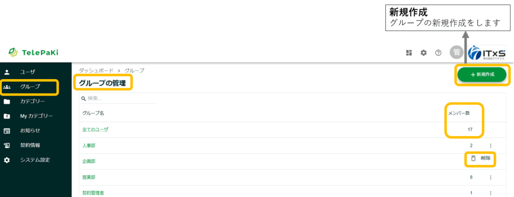 グループ管理では、例えば営業部・総務部、九州エリア、関東事業所、埼玉支店などのグループを作ることができます。ダッシュボードから、設定を選択します。 グループ > グループの管理から、グループの一覧、メンバー数の確認、新規作成、削除ができます。メンバー数はグループに関連付けているユーザの数です。メンバーの編集をする際は、編集したいグループをクリックすることで編集可能です。 グループの作り方は、こちら