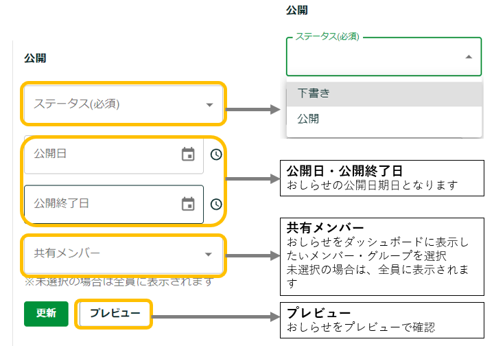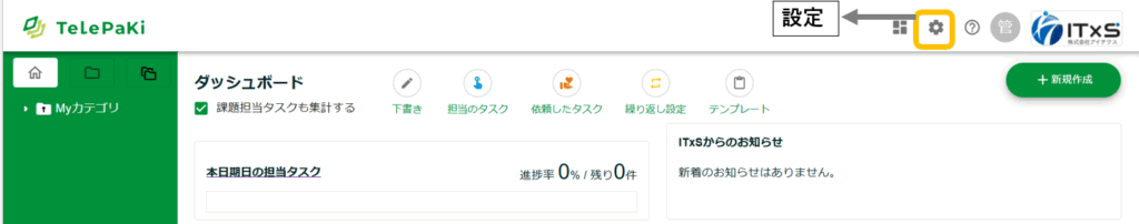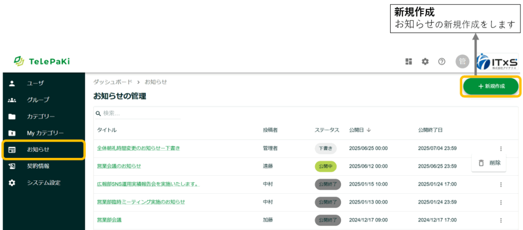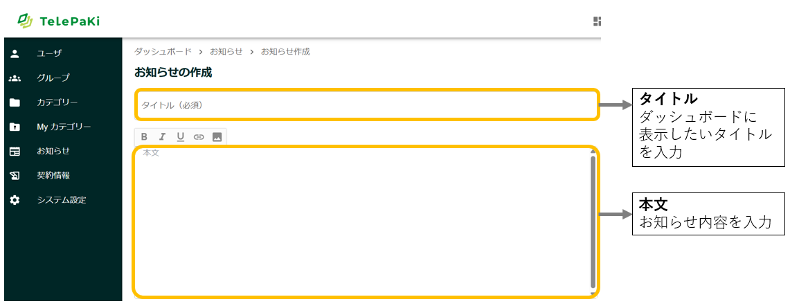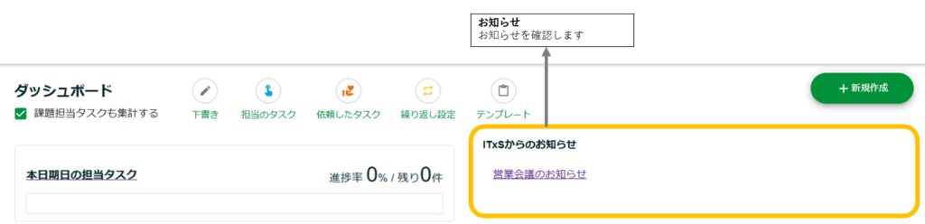 お知らせ作成の流れを紹介いたします。 新規作成をクリック 設定から、お知らせの表示を確認して、新規作成をクリックします。 お知らせを入力 お知らせ作成画面にて、必須項目などを入力します。 ダッシュボードを確認 ダッシュボードのお知らせをご確認ください。