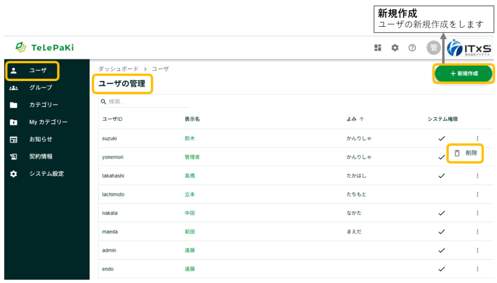 ダッシュボードから、設定を選択します。 ユーザ > ユーザの管理から、ユーザの一覧(ユーザID、システム権限の有無など)を確認できます。ユーザーの新規作成、削除ができます。表示名をクリックすると、ユーザ編集ページが開き、編集ができます。 ユーザの作り方は、こちら