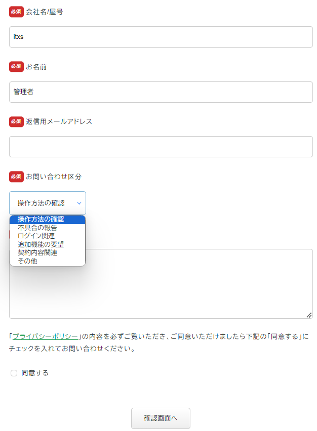 お問い合わせ区分を選び、お問い合わせ内容を記載、プライバシーポリシーの確認をいただき、確認画面へ、送信してください。