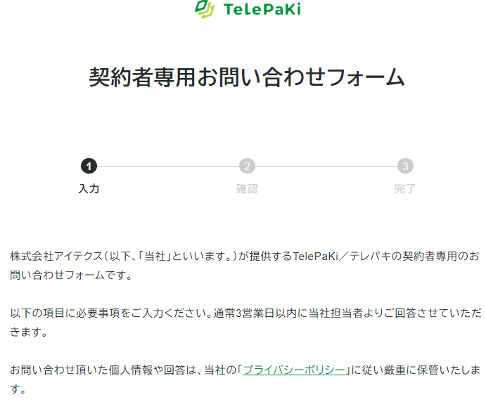 別ページで、テレパキご利用者向けのお問い合わせフォームが表示されます。