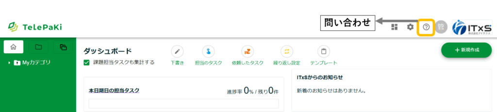 お問い合わせ方法について、ご説明いたします。ダッシュボードから、問い合わせを選択します。