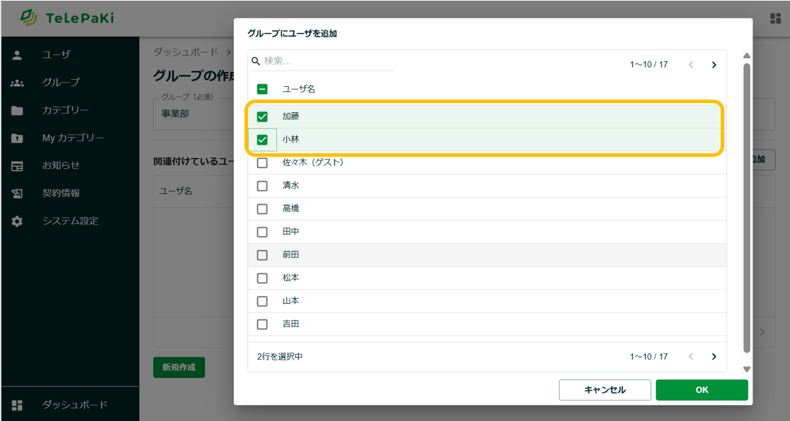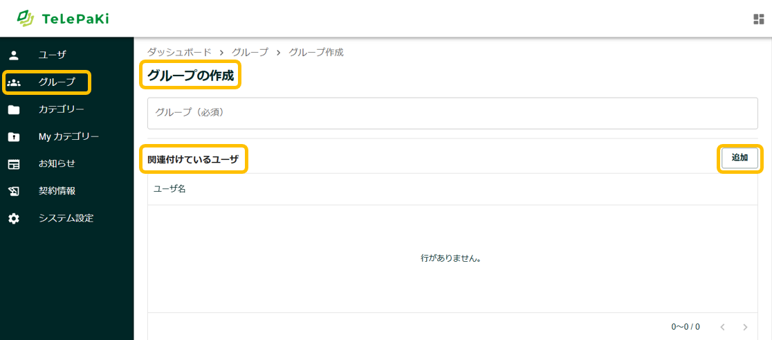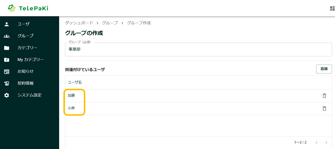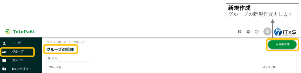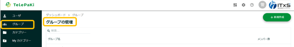 テレパキ管理者様用のスタートガイドです。グループ作成の流れをご紹介します。 グループの新規作成 設定からグループを選択、グループの管理の表示を確認して、新規作成をクリックします。 グループ名、関連付けているユーザを編集 グループの作成にて、必須項目グループ名を入力します。関連付けているユーザの編集にて、そのグループに関連するユーザを選んでください。 グループの作成を確認する グループの管理より、追加したグループと、メンバー数をご確認ください。 次のSTEP カテゴリーの設定をする