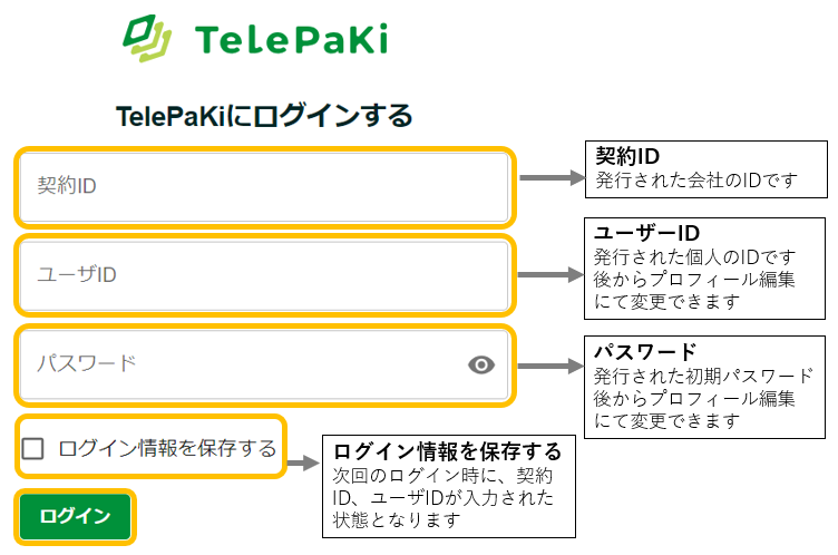 テレパキ管理者様用のスタートガイドです。ご利用開始までの流れをご紹介します。 招待メッセージをもらう テレパキ担当者から、契約ID、ユーザーID、パスワードを受け取ります。 ログインする テレパキログイン画面より、契約ID、ユーザーID、パスワードを入力して、ログインをクリックします。 ログインを確認する ダッシュボードの画面になりましたら、ログイン完了です!設定 > ユーザの管理にて、管理者があるか確認できます。 次のSTEP システム設定をする