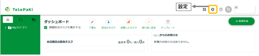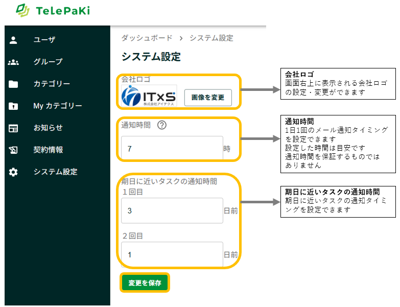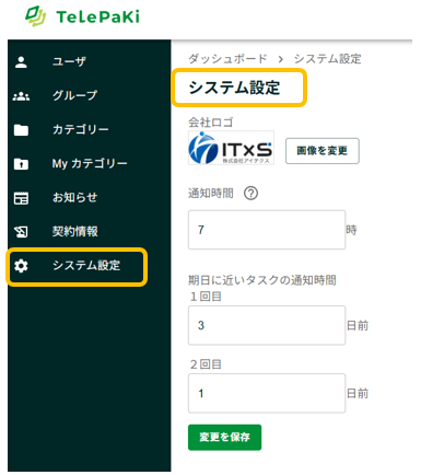 テレパキ管理者様用のスタートガイドです。システム設定の流れをご紹介します。 システム設定を選択 設定から、システム設定クリック、表示します 会社ロゴ・システム通知設定 ダッシュボードに表示される、会社ロゴ・システム通知など設定します。