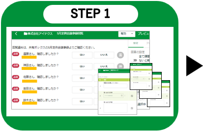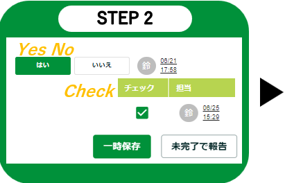 1クリックでチェック。同時に、回答者と時刻が打刻されます。タスクの一時保存も出来て、タスク内の進捗率も分かります。