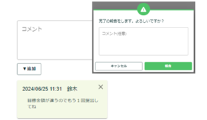 報告のときなど、コメントを入れられます。またメール通知設定ができて、状況は即時反映されるので、タイムロスもありません。