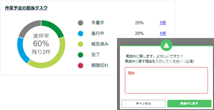 タスクを途中まで作業して、一時保存で「進行中」、完了報告で「報告済み」、やり直しの場合はまた「進行中」。自分でステータスを選ばなくても、タスクの状況が変化します。